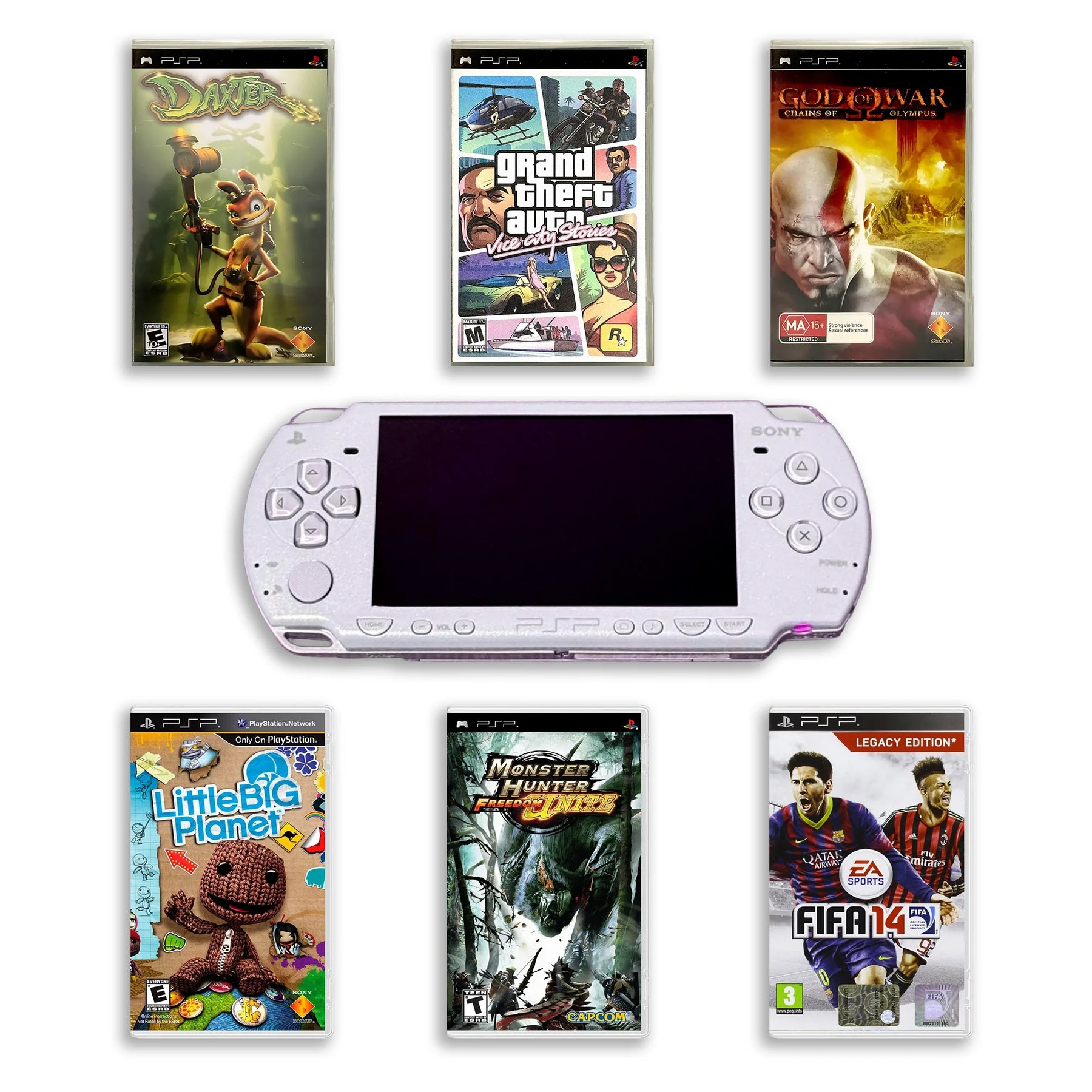 Títulos de juegos populares:FIFA 14 , Little Big Planet , GTA Vice City Stories, Monster Hunter Freedom Unite, God of War: Chains of Olympus, Dexter.